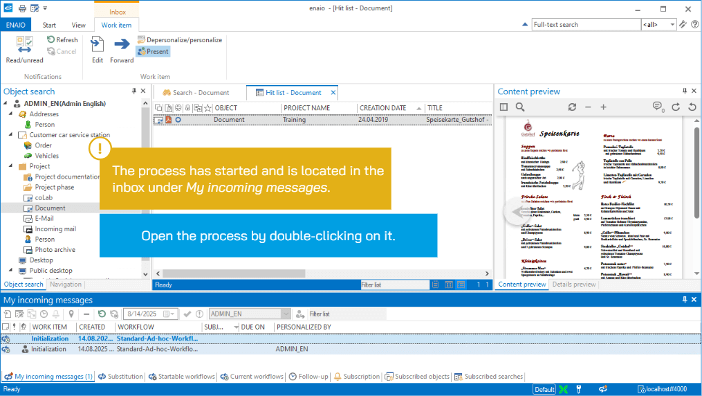 In our e-learning courses, we guide learners through practical scenarios. We use clickable simulations or virtual exercise environments to increase motivation and encourage learners to carry out exercises themselves. In guided simulations, for example, learners can practice how to start an ad-hoc workflow from a hit list, what they need to pay attention to and how the software behaves in the process. This helps them spot potential challenges and work confidently with the system.